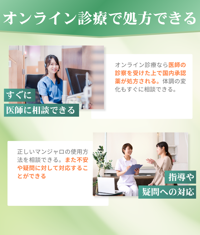 オンライン診療では、こうしたマンジャロの使い方の指導や疑問への対応も受けられる。まずはオンライン診療で、マンジャロの処方が可能かどうか相談してみるとよいだろう。