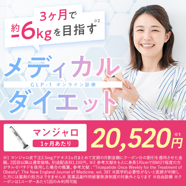 • マンジャロによる治療は自由診療です。この記事は自由診療に関する情報を含みます。※ 医師の判断により対面診療が必要な場合や、処方できない場合があります。