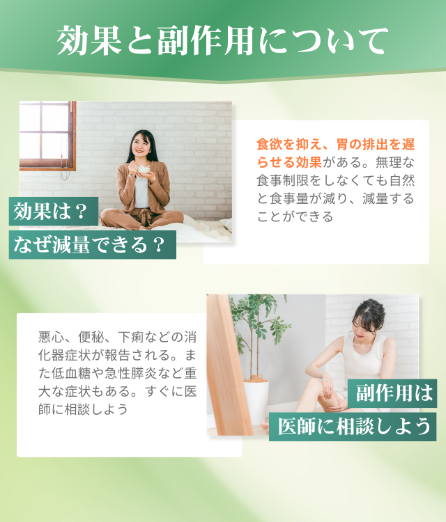 また、診察時にはマンジャロの効果や副作用、使用方法も詳しく説明される。