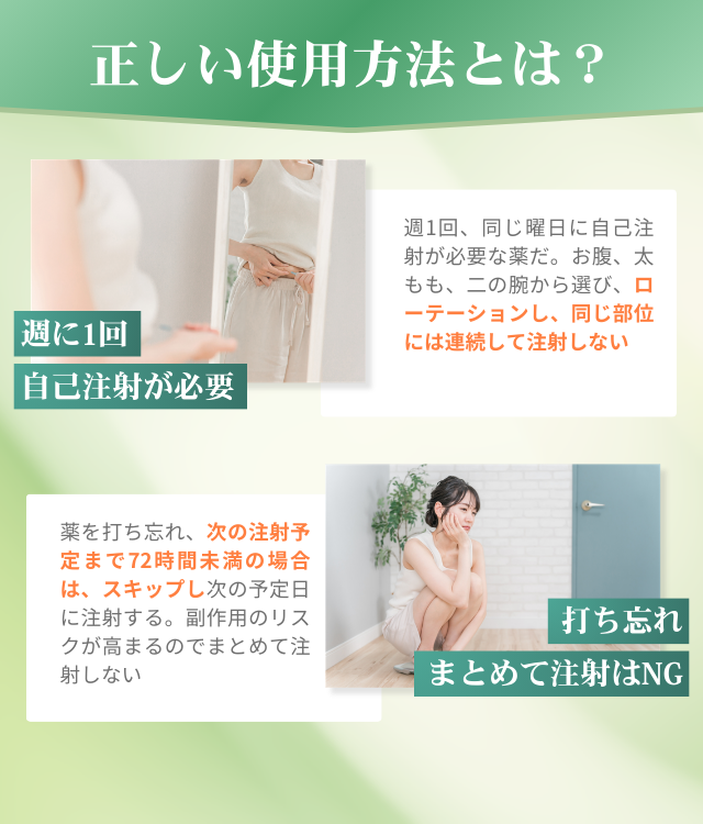 また、マンジャロの効果を引き出すには、正しい使用方法を守ることが欠かせない。基本は週1回、同じ曜日に自己注射し、注射部位は毎回ローテーションする。打ち忘れた場合は、次回の注射予定日までの残り日数に応じて対応を変える必要がある。