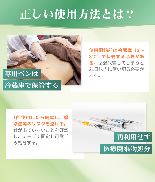 付属の針は1回使ったら必ず廃棄する必要がある。自己注射でも針の使い回しは厳禁だ。針は再使用できないように注射器が工夫されているが、万が一再利用すると、次のようなリスクがある。