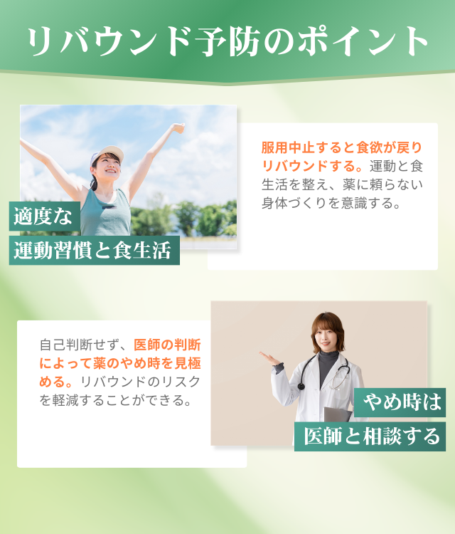 そのため、対策を考えずに急にやめてしまうのは避けたい。ポイントを押さえたうえで、リバウンドしにくい状態を作っていくことが重要である。