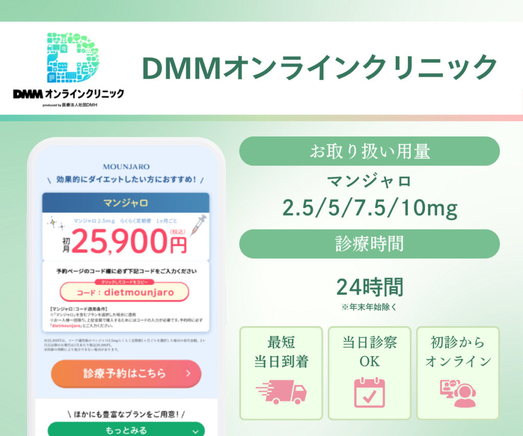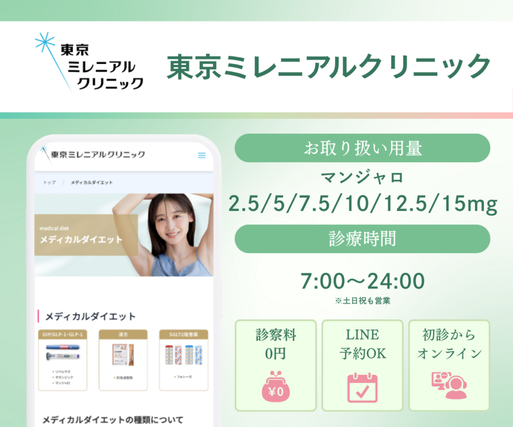 • マンジャロによる治療は自由診療です。この記事は自由診療に関する情報を含みます。※ 医師の判断により対面診療が必要な場合や、処方できない場合があります。