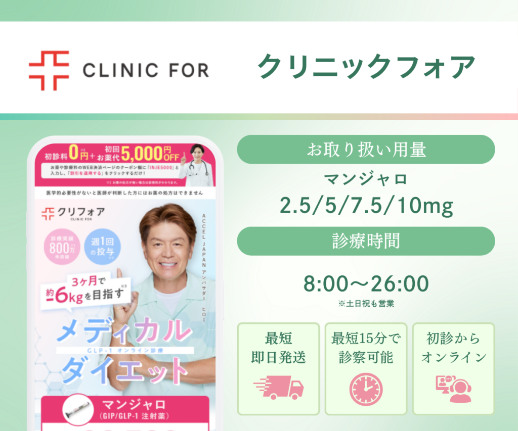 クリニックフォアは、全国に13院を展開する医療法人社団エムズが運営するオンライン診療サービスだ。初月は2.5mg、2ヶ月目以降は5mgを自動で届ける定期配送プランが用意されており、一般的な増量の流れに合わせて続けやすい設計になっている。